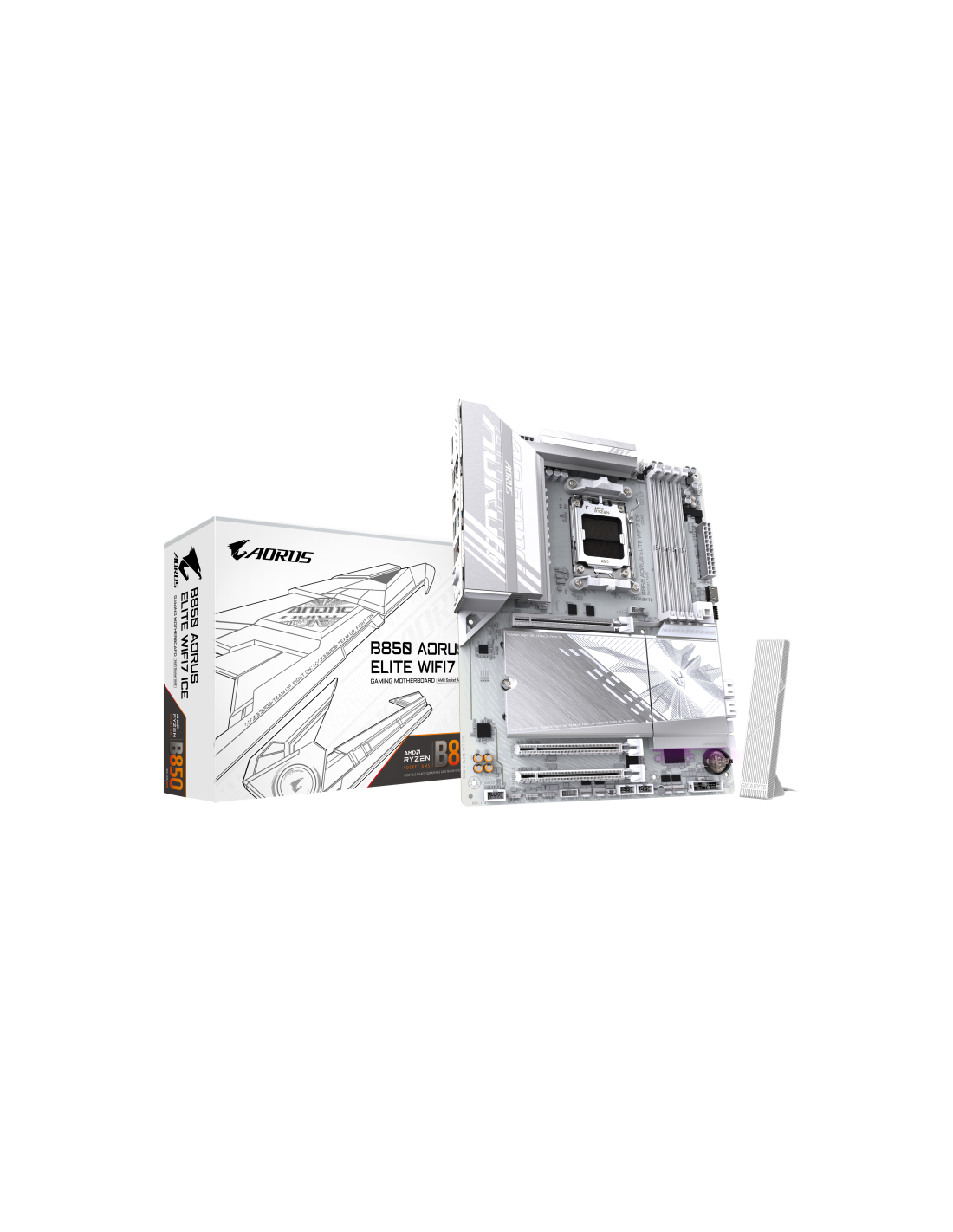 GIGABYTE B850 AORUS ELITE WIFI7 ICE Placa Base - Procesadores AMD Ryzen Serie 9000, VRM digital de 14+2+2 fases, hasta 8200MHz DDR5 (OC), 1xPCIe 5.0 + 2xPCIe 4.0 M.2, LAN 2.5, WIFI 7, USB 3.2 Gen 2x2. Fabricante de procesador: AMD, Socket de procesador: Zócalo AM5, Procesador compatible: AMD Ryzen 7000 Series, AMD Ryzen 8000 Series, AMD Ryzen 9000 Series. tipos de memoria compatibles: DDR5-SDRAM, Memoria interna máxima: 256 GB, Tipo de ranuras de memoria: DIMM. Interfaces de disco de almacenamiento soportad