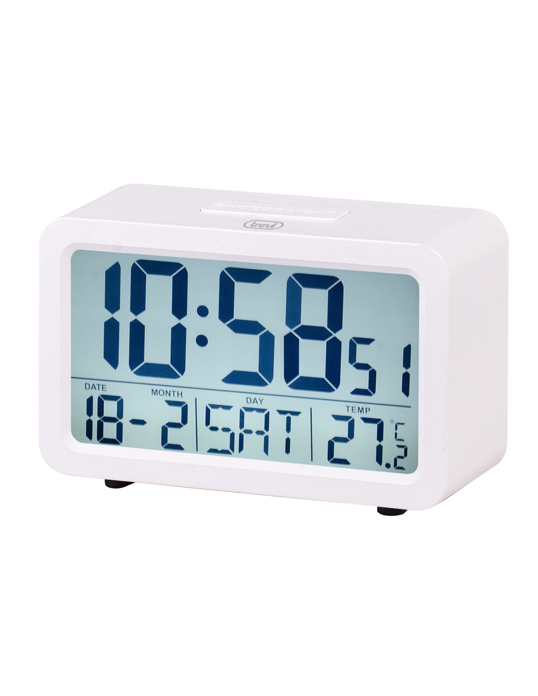 Trevi SLD 3P60. Tipo: Reloj despertador digital, Forma: Rectángulo, Color del producto: Blanco. Fuente de energía: Batería, Tipo de batería: AA. Ancho: 103 mm, Altura: 42 mm, Profundidad: 67 mm. Cantidad por paquete: 1 pieza(s), Ancho del paquete: 115 mm, Profundidad del paquete: 53 mm