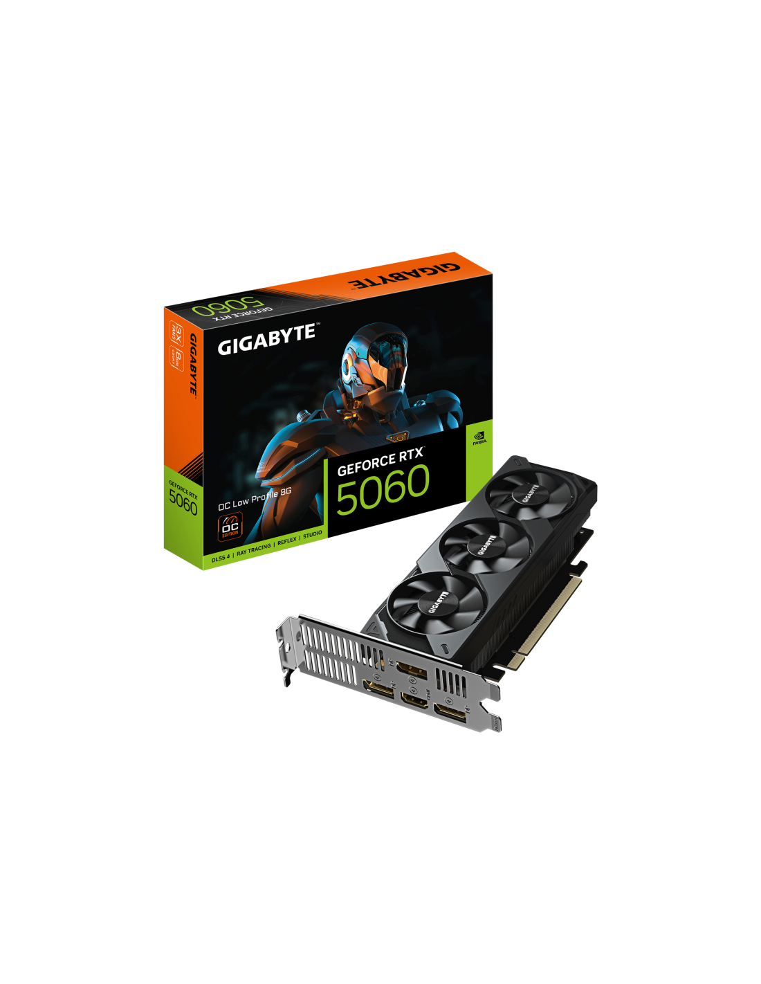 GIGABYTE GeForce RTX 5060 OC Low Profile 8G Tarjeta Gráfica - 8GB GDDR7, 128bit, PCI-E 5.0, 2512 MHz Frecuencia del núcleo, 3 x DisplayPort, 1 x HDMI, GV-N5060OC-8GL. Familia de procesadores de gráficos: NVIDIA, Procesador gráfico: GeForce RTX 5060, Frecuencia del procesador: 2512 MHz. Capacidad memoria de adaptador gráfico: 8 GB, Tipo de memoria de adaptador gráfico: GDDR7, Ancho de datos: 128 bit, Velocidad de memoria del reloj: 28000 MHz. Máxima resolución: 7680 x 4320 Pixeles. Versión DirectX: 12.0, Ver