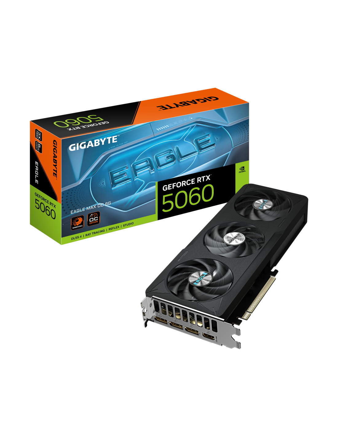 GIGABYTE GeForce RTX 5060 EAGLE MAX OC 8G Tarjeta Gráfica – 8 GB GDDR7, 128 bits, PCI-E 5.0, frecuencia de núcleo 2550 MHz, 3 x DisplayPort, 1 x HDMI, NVIDIA DLSS 4, GV-N5060EAGLEMAX OC-8GD 1.0. Familia de procesadores de gráficos: NVIDIA, Procesador gráfico: GeForce RTX 5060, Frecuencia del procesador: 2550 MHz. Capacidad memoria de adaptador gráfico: 8 GB, Tipo de memoria de adaptador gráfico: GDDR7, Ancho de datos: 128 bit, Velocidad de memoria del reloj: 28000 MHz. Versión DirectX: 12.0, Versión OpenGL: