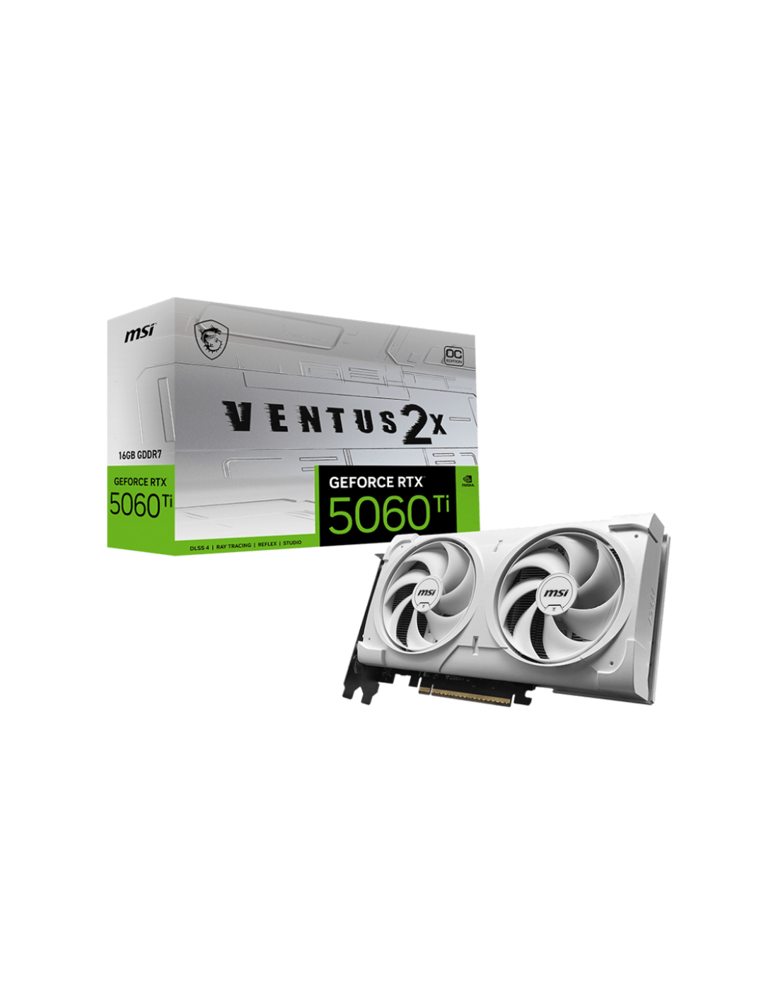 MSI VENTUS GEFORCE RTX 5060 TI 16G 2X OC WHITE PLUS. Familia de procesadores de gráficos: NVIDIA, Procesador gráfico: GeForce RTX 5060 Ti. Capacidad memoria de adaptador gráfico: 16 GB, Tipo de memoria de adaptador gráfico: GDDR7, Ancho de datos: 128 bit. Máxima resolución: 7680 x 4320 Pixeles. Versión DirectX: 12 Ultimate, Versión OpenGL: 4.6. Tipo de interfaz: PCI Express x16 5.0. Tipo de enfriamiento: Activo, Número de ventiladores: 2 Ventilador(es)
